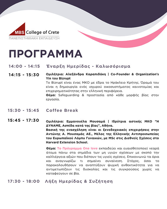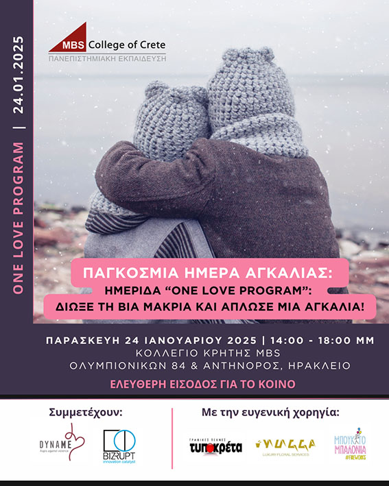 Στο πλαίσιο της σημερινής Παγκόσμιας Ημέρας Αγκαλιάς, το Κολλέγιο Κρήτης MBS σε συνεργασία με την Dyname Aspis against Violence και την Bizrupt, πραγματοποιούν ημερίδα με θέμα