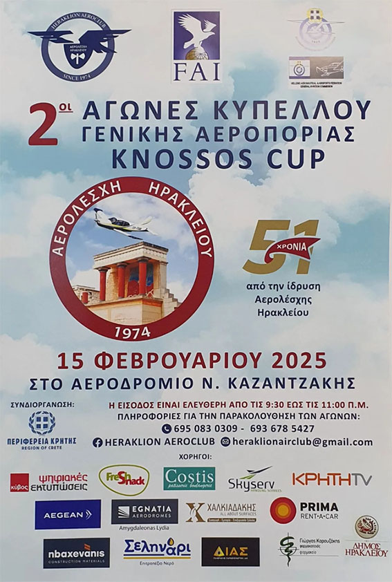 Η Αερολέσχη Ηρακλείου, σε συνδιοργάνωση με την Περιφέρεια Κρήτης, διοργανώνει τους αγώνες γενικής αεροπορίας με τίτλο «2o KNOSSOS CUP», που θα διεξαχθούν στο Αεροδρόμιο Ηρακλείου «Νίκος Καζαντζάκης».