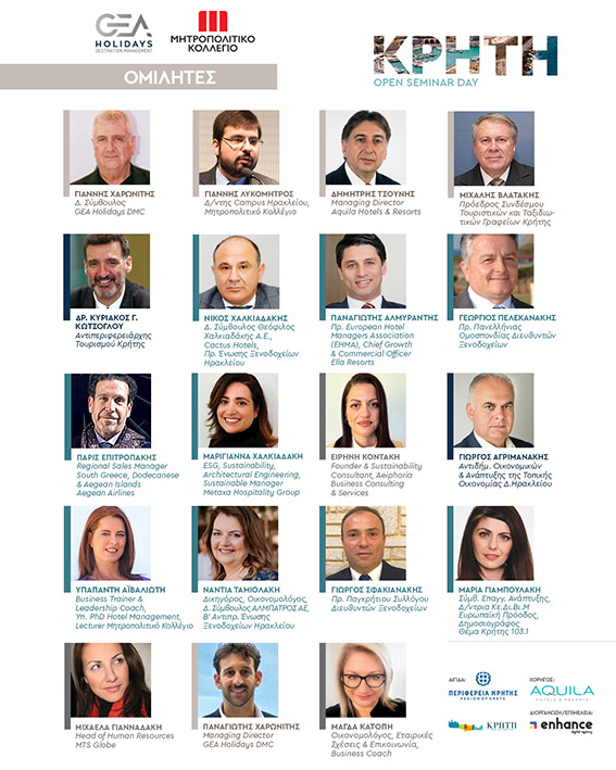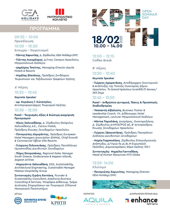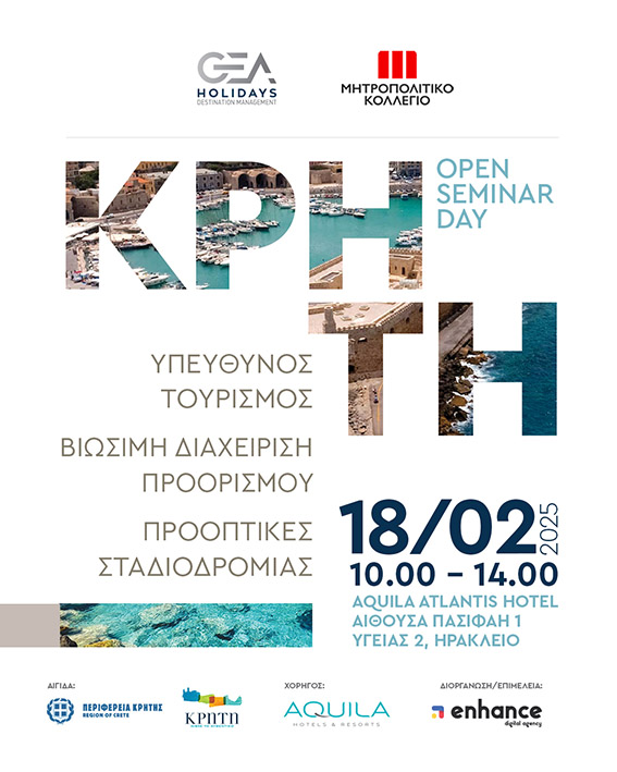 Την Τρίτη, 18 Φεβρουαρίου 2025, η GEA Holidays DMC μαζί με το Μητροπολιτικό Κολλέγιο, Campus Ηρακλείου, πραγματοποιούν το επιμορφωτικό σεμινάριο / Ημερίδα “Κρήτη- Υπεύθυνος Τουρισμός, Βιώσιμη διαχείριση Προορισμού, Προοπτικές Σταδιοδρομίας”, στο Aquila Atlantis Hotel, στις 10:00 π.μ. στην Αίθουσα ΠΑΣΙΦΑΗ 1, Υγείας 2, Ηράκλειο.