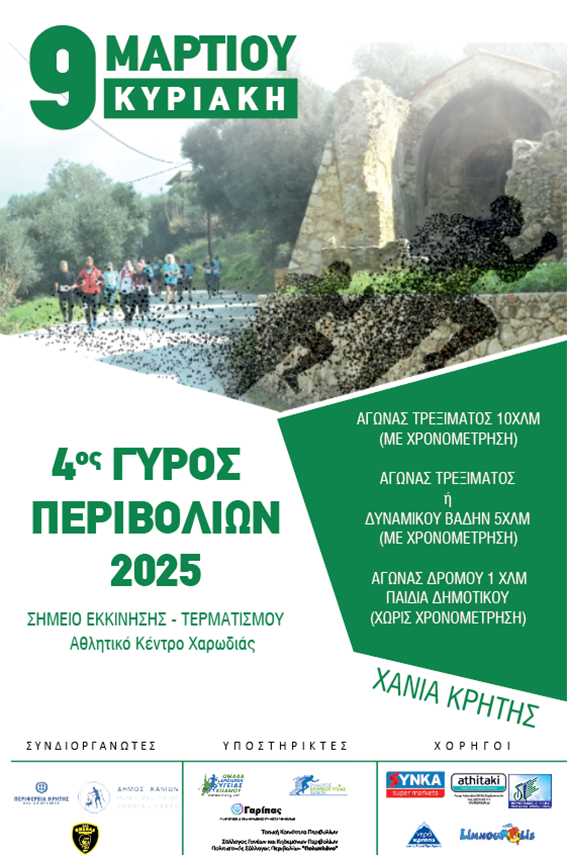 Ξεκίνησαν οι εγγραφές για τον «ΓΥΡΟ ΠΕΡΙΒΟΛΙΩΝ 2025», μια αθλητική εκδήλωση, που απευθύνεται σε αθλητές, δρομείς αλλά και σε λάτρεις της φύσης με σκοπό την προώθηση και διάδοση του αθλητικού πνεύματος και την ανάδειξη της φυσικής ομορφιάς του τόπου μας.