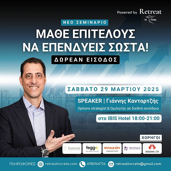 Για πρώτη φορά στο Ηράκλειο, το Retreat in Crete διοργανώνει ένα δωρεάν σεμινάριο με θέμα τη σωστή διαχείριση των επενδύσεων, ανοιχτό σε όλους όσοι θέλουν να κάνουν τα πρώτα τους βήματα στον κόσμο των επενδύσεων ή να βελτιώσουν τη στρατηγική τους.