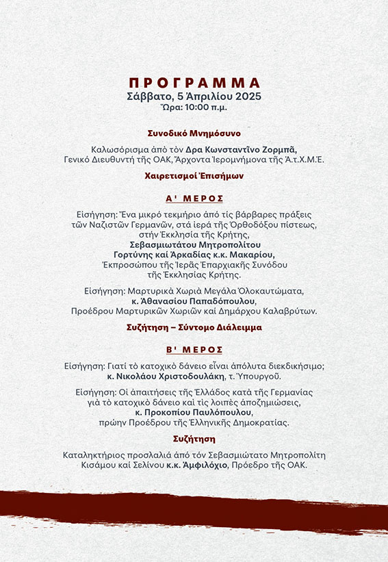 Η Ημερίδα θα ολοκληρωθεί με την καταληκτήρια ομιλία του Σεβασμιώτατου Μητροπολίτου Κισάμου και Σελίνου κ. Αμφιλοχίου, Προέδρου της ΟΑΚ, ο οποίος θα συνοψίσει τα βασικά σημεία των εισηγήσεων, υπογραμμίζοντας τη διαχρονική σημασία της διατήρησης της ιστορικής μνήμης.
