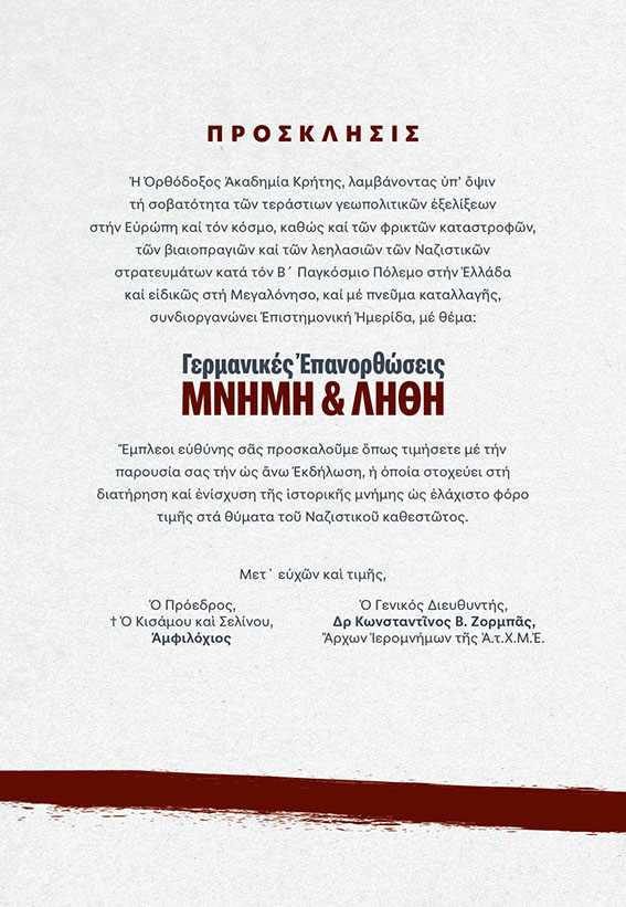 Η Ορθόδοξος Ακαδημία Κρήτης, σε συνεργασία με την Περιφέρεια Κρήτης, την Περιφερειακή Ένωση Δήμων, καθώς και τους Δήμους Πλατανιά, Καντάνου-Σελίνου και Κισάμου, διοργανώνει Ημερίδα με θέμα «Γερμανικές Επανορθώσεις: Μνήμη και Λήθη». Η Εκδήλωση θα λάβει χώρα το