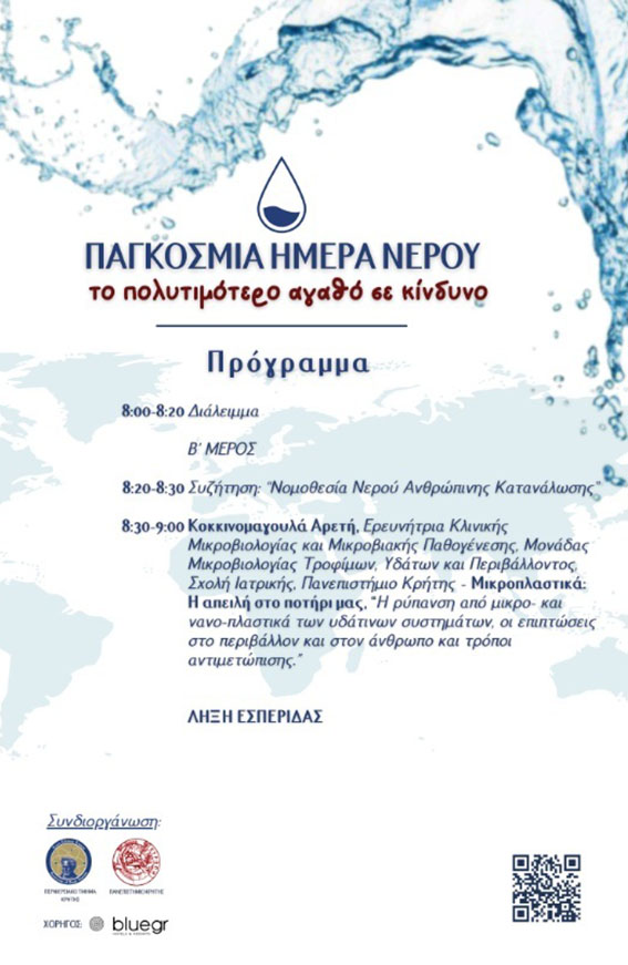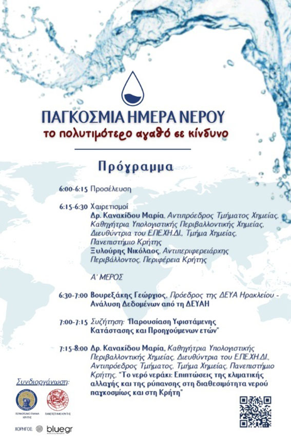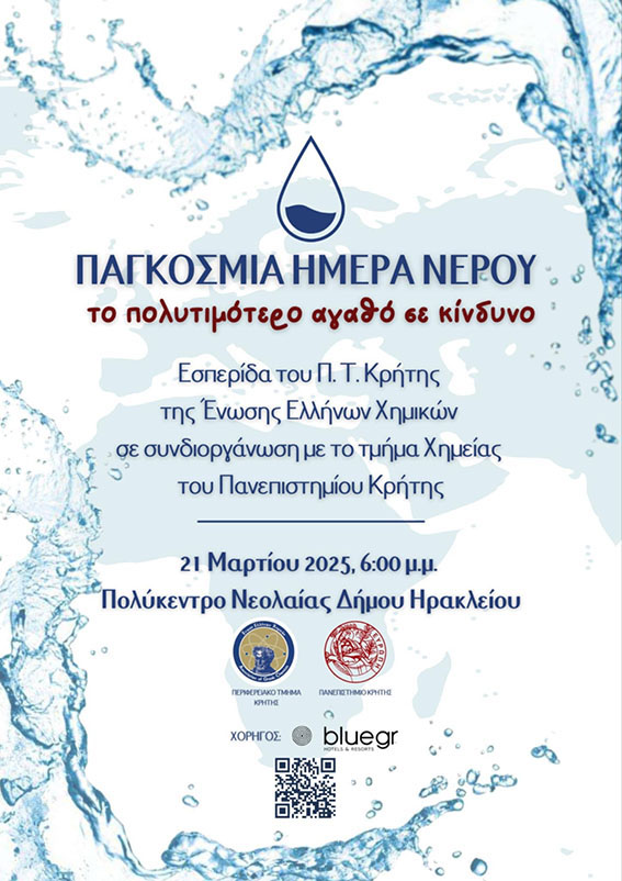 Το Περιφερειακό Τμήμα Κρήτης της Ένωσης Ελλήνων Χημικών σε συνεργασία με το Τμήμα Χημείας του Πανεπιστημίου Κρήτης, διοργανώνει εσπερίδα για τον εορτασμό της Παγκόσμιας Ημέρας Νερού, με θέμα: