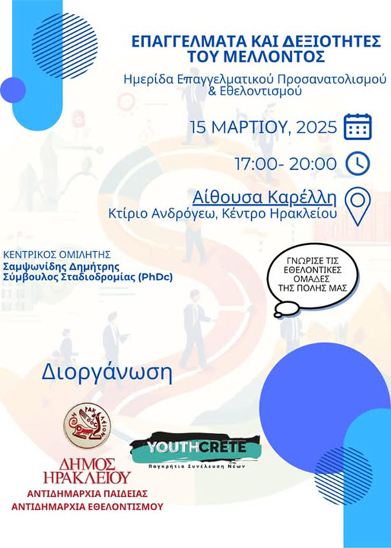 Ημερίδα Επαγγελματικού Προσανατολισμού με θέμα «Επαγγέλματα και Δεξιότητες του Μέλλοντος» διοργανώνει ο Δήμος Ηρακλείου μέσω των Αντιδημαρχιών Εθελοντισμού και Παιδείας σε συνεργασία με το Youth Crete το
