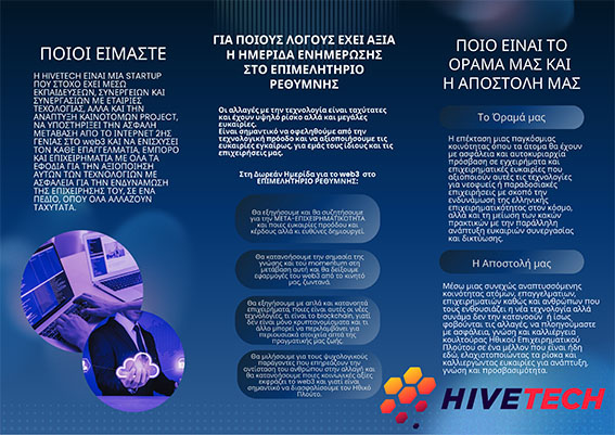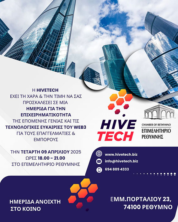 Ημερίδα με θέμα «Η επιχειρηματικότητα και η σύνδεση της με το ιντερνετ τρίτης γενιάς (web 3). Πως να αξιοποιήσουμε την τεχνολογία του Blockchain στις δικές μας επιχειρήσεις», διοργανώνει η startup εταιρεία «Hivetech», την
