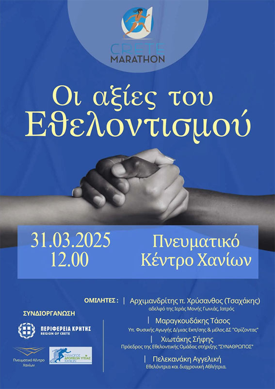 Ο Σύλλογος Δρομέων Υγείας Χανίων, η Περιφέρεια Κρήτης – Περιφερειακή Ενότητα Χανίων και το Πνευματικό Κέντρο Χανίων συνδοργανώνουν ημερίδα με θέμα :
