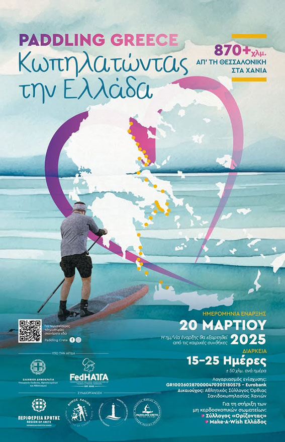 με τη συνοδεία του Γιάννη Α. Κυριακάκη, Τάσου Νικολόπουλου και Νίκου Μαρμαριτσάκη θα διασχίσουν όλη την Ελλάδα πάνω σε μια σανίδα όρθιας κωπηλασίας (SUP), από τη Θεσσαλονίκη έως τα Χανιά, μια διαδρομή άνω των 870 χιλιομέτρων. Μια τεράστια πρόκληση, γεμάτη δοκιμασίες, κύματα, αντίξοες συνθήκες, αλλά και αμέτρητα συναισθήματα.