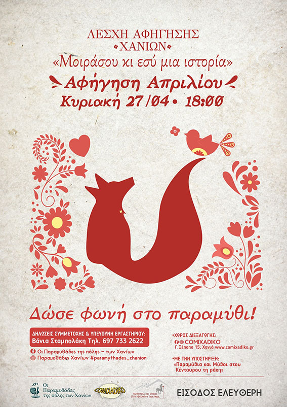 Οι Παραμυθάδες της πόλης-των Χανίων σε συνδιοργάνωση με το Comixadiko και την υποστήριξη του Παραμύθια και μύθοι στου Κένταυρου τη ράχη, υλοποιούν για 2η χρονιά στην πόλη των Χανίων το εργαστήρι Αφήγησης