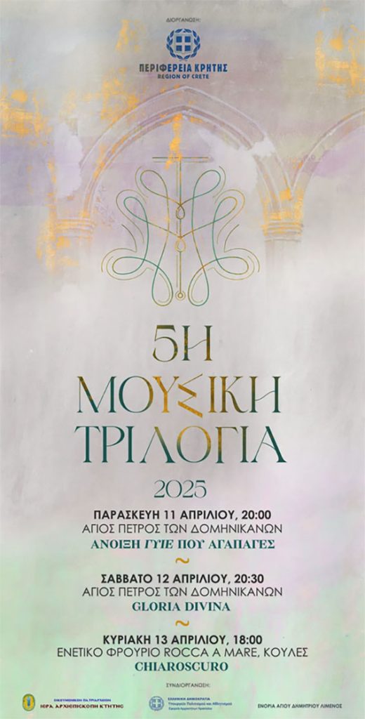 Με δωρεάν είσοδο στους πολίτες και σε κατανυκτικό κλίμα, θα πραγματοποιηθεί η 5η Μουσική τριλογία για τα μνημεία του Χάνδακα με συνδιοργανωτές την Περιφέρεια Κρήτης,