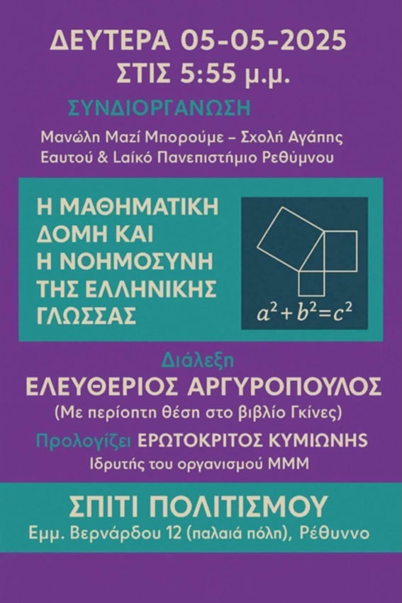 «Η μαθηματική δομή και η νοημοσύνη της ελληνικής γλώσσας», με ομιλητή τον Ελευθέριο Αργυρόπουλο, έναν ιδιαίτερα αναγνωρισμένο ερευνητή που κατέχει θέση στο Βιβλίο Guinness για το έργο και τις γνώσεις του.