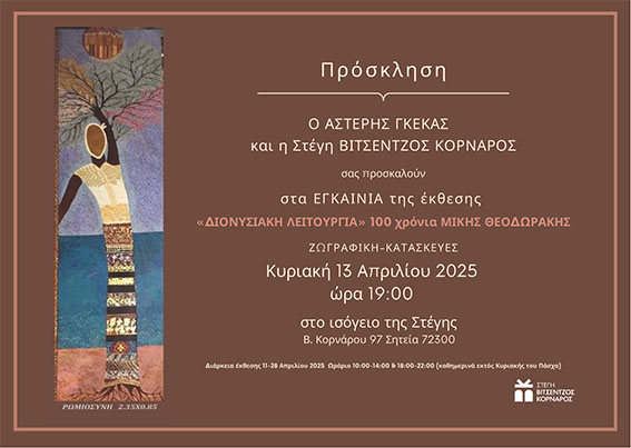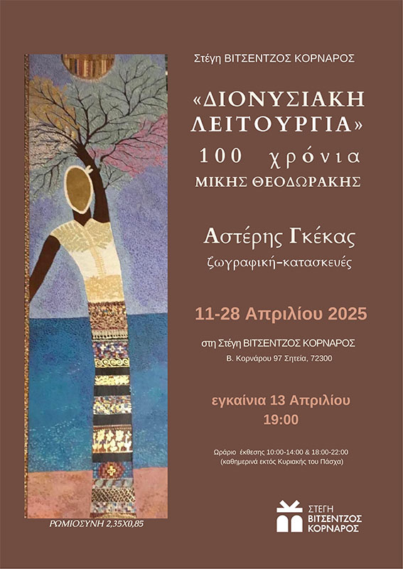 «Το εικαστικό οδοιπορικό μου “ΔΙΟΝΥΣΙΑΚΗ ΛΕΙΤΟΥΡΓΙΑ για τα 100 χρόνια ΜΙΚΗΣ ΘΕΟΔΩΡΑΚΗΣ” συμπίπτει με την εκτύπωση του ημερολογίου της Στέγης ΒΙΤΣΕΝΤΖΟΣ ΚΟΡΝΑΡΟΣ, αφιέρωμα στον Μίκη.