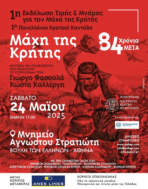Το Παγκρήτιο Κέντρο Πολιτισμού, συνδιοργανώνει με την Περιφέρεια Κρήτης, εκδήλωση τιμής και μνήμης για τα 84 χρόνια από τη ΜΑΧΗ ΤΗΣ ΚΡΗΤΗΣ, στο Μνημείο του Αγνώστου Στρατιώτη στην Αθήνα, μπροστά από το κτήριο της Ελληνικής Βουλής, το