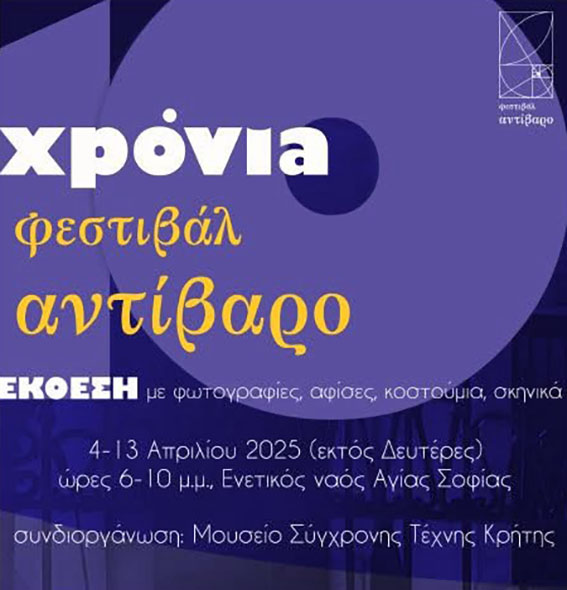 Το Φεστιβάλ Αντίβαρο, γιορτάζοντας τη συμπλήρωση 10 χρόνων δημιουργικής παρουσίας στα πολιτιστικά δρώμενα της Κρήτης, διοργανώνει έκθεση με τίτλο «10 Χρόνια Φεστιβάλ Αντίβαρο: Κοστούμια, Σκηνικά και Αφίσες».
