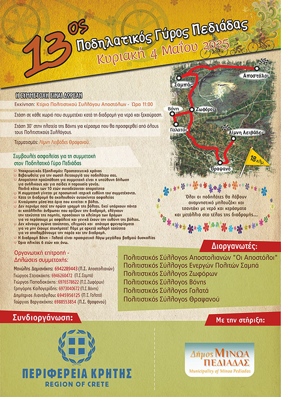 Στις 4 Μαΐου 2025, ημέρα Κυριακή και ώρα 11:00 θα πραγματοποιηθεί ο Ποδηλατικός Γύρος Πεδιάδος, για 13η χρονιά όπως έχει καθιερωθεί.
