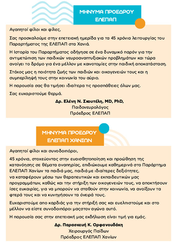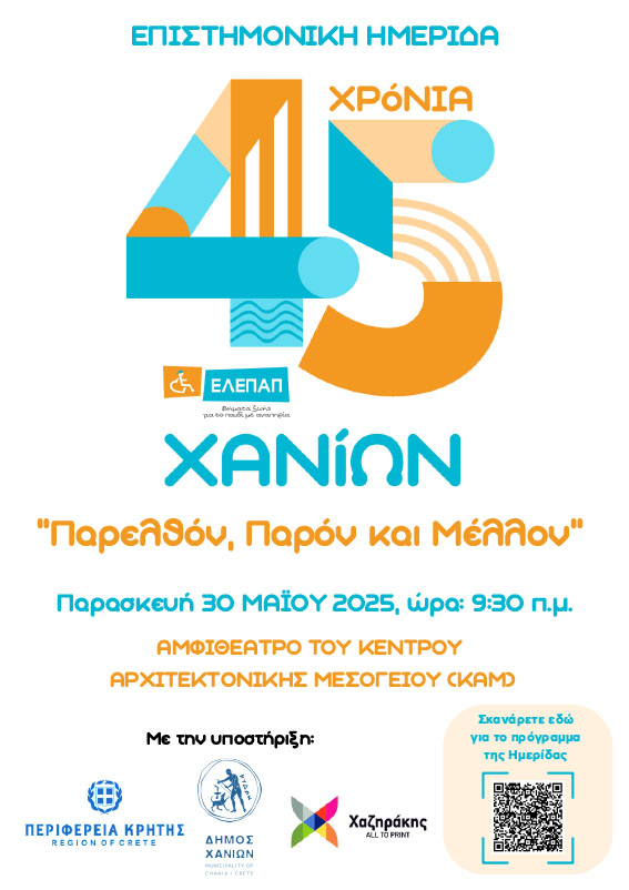 Η ΕΛΕΠΑΠ Χανίων τιμά το παρελθόν της, αναδεικνύει το παρόν της και ανοίγει τον δρόμο προς ένα μέλλον με καινοτομίες και ίσες ευκαιρίες για κάθε παιδί. Η παρουσία σας στην επετειακή αυτή εκδήλωση θα αποτελέσει τιμή και στήριξη στον κοινό μας αγώνα για ένα αύριο χωρίς αποκλεισμούς.