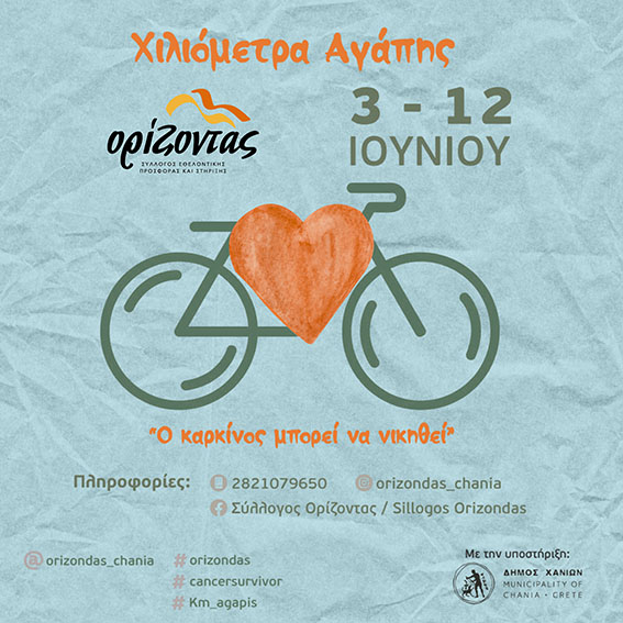 Ο Σύλλογος “Ορίζοντας” με αφορμή την Παγκόσμια Ημέρα Ποδηλάτου (3 Ιουνίου) και την Παγκόσμια Ημέρα Επιζώντων του Καρκίνου (1η Κυριακή του Ιουνίου) διοργανώνει και φέτος συμβολικό Ποδηλατικό Αγώνα σε virtual μορφή, για μικρούς και μεγάλους! Θα γιορτάσουμε όλοι μαζί, συγκεντρώνοντας όσα περισσότερα χιλιόμετρα αγάπης μπορούμε με τα ποδήλατά μας, διαδίδοντας το μήνυμα: “Ο καρκίνος μπορεί να νικηθεί!” και δίνοντας δύναμη σε όσους νοσούν και δίνουν το δικό τους καθημερινό αγώνα.