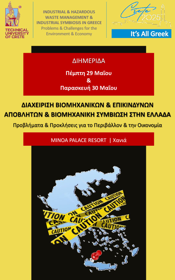 Το Πολυτεχνείο Κρήτης ανακοινώνει τη διεξαγωγή του 8ου Διεθνούς Συνεδρίου για τη Διαχείριση Βιομηχανικών και Επικίνδυνων Αποβλήτων – CRETE 2025, το οποίο θα πραγματοποιηθεί στα Χανιά στις εγκαταστάσεις του MINOA PALACE RESORT στις