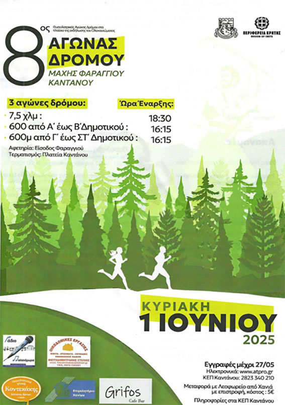 Την Κυριακή 1 Ιουνίου 2025 και ώρα 18:00, η Κάντανος Χανίων υποδέχεται δρομείς από κάθε γωνιά της Κρήτης (και όχι μόνο!) στον 8ο Αγώνα Δρόμου Μάχης Φαραγγιού Καντάνου, έναν μοναδικό αγώνα απόστασης 7,5 χιλιομέτρων, που συνδυάζει τον αθλητισμό, τη μνήμη και τη φυσική ομορφιά του τόπου.