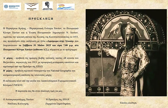 H Περιφέρεια Κρήτης – Περιφερειακή Ενότητα Χανίων, το Πνευματικό Κέντρο Χανίων και η Ένωση Πνευματικών Δημιουργών Ν. Χανίων, τιμώντας την τραγική επέτειο της Άλωσης της Κωνσταντινούπολης το 1453, σας προσκαλούν στην εκδήλωση με τίτλο «Αφιέρωμα στην Άλωση» που διοργανώνουν το