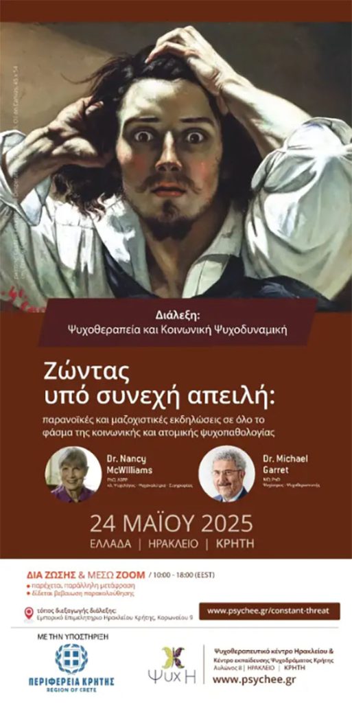 Σε αυτό το πλαίσιο, και με την πολύτιμη υποστήριξη της Περιφέρειας Κρήτης, το ΨΥΧ.Η. διοργανώνει στο Ηράκλειο μία εξαιρετικής σημασίας διεθνή επιστημονική εκδήλωση με θέμα: «Ζώντας υπό συνεχή απειλή: Παρανοϊκές και μαζοχιστικές εκδηλώσεις σε όλο το φάσμα της κοινωνικής και ατομικής ψυχοπαθολογίας».