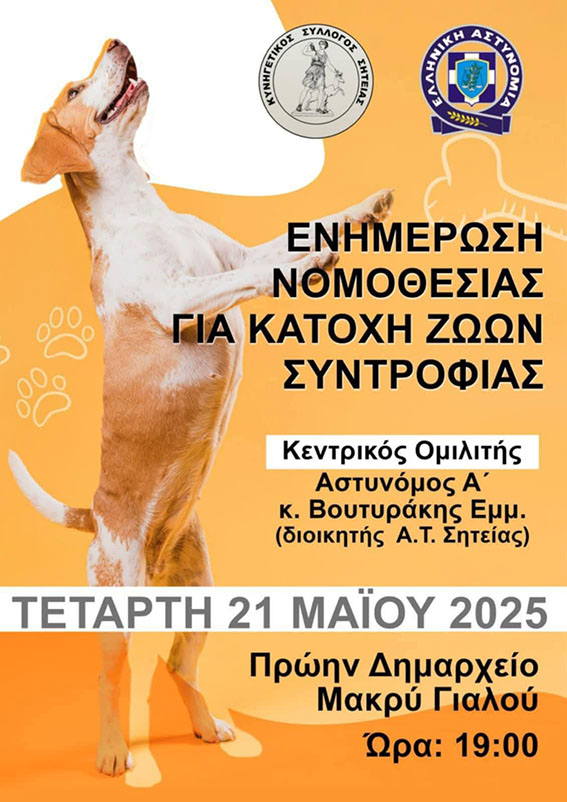 Ο Κυνηγετικός Σύλλογος Σητείας και το Αστυνομικό Τμήμα Σητείας σας προσκαλούν σε μια σημαντική ενημερωτική εκδήλωση με θέμα τη νομοθεσία που διέπει την κατοχή και φροντίδα ζώων συντροφιάς, την