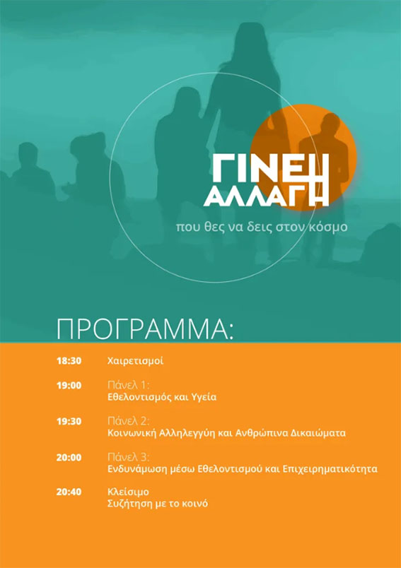 «Έλα να εμπνευστείς και να γίνεις μέρος της αλλαγής!», είναι το σύνθημα της εκδήλωσης που στοχεύει ν’ αναδείξει τον ρόλο του εθελοντισμού ως μοχλό προσωπικής ανάπτυξης, κοινωνικής συμμετοχής και συλλογικής προσφοράς.
