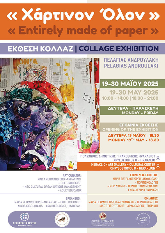 Μια νέα έκθεση κολλάζ, σε επιμέλεια της Μαρίας Πετρακογιώργη, παρουσιάζεται στον πολυχώρο της Δημοτικής Πινακοθήκης Ηρακλείου, σε συνδιοργάνωση με την Περιφέρεια Κρήτης, από την Δευτέρα 19 έως και την Παρασκευή 30 Μάϊου 2025.