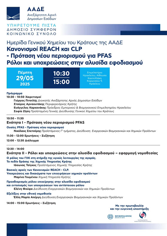 Το Γενικό Χημείο του Κράτους της Ανεξάρτητης Αρχής Δημοσίων Εσόδων (ΑΑΔΕ), ως η αρμόδια εθνική αρχή για την εφαρμογή των ευρωπαϊκών κανονισμών REACH και CLP, διοργανώνει ενημερωτική ημερίδα με τίτλο: