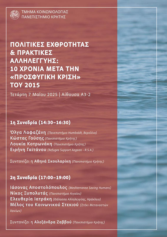 Δέκα χρόνια μετά τα δραματικά γεγονότα της προσφυγικής κρίσης του 2015, το Τμήμα Κοινωνιολογίας του Πανεπιστημίου Κρήτης διοργανώνει επιστημονική ημερίδα με τίτλο: