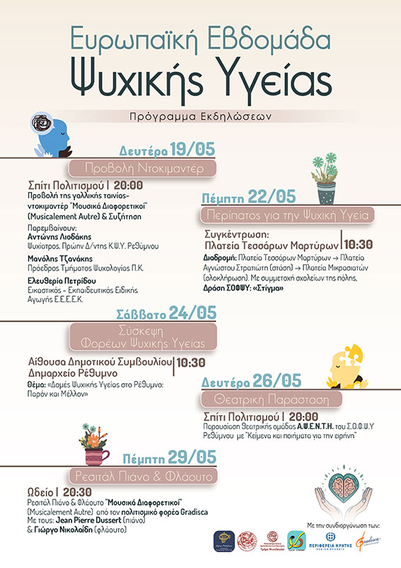 Ο Δήμος Ρεθύμνης και η Περιφέρεια στέκονται στο πλευρό μας τόσο με τη συνέργεια τους, όσο και με την οικονομική υποστήριξη τους σε αυτό το πρόγραμμα που διαθέτει ξεχωριστή δυναμική και πρωτοτυπία. Αθροίζουμε πολλές δυνάμεις στη διοργάνωση μιας σειράς δράσεων γενικότερης κινητοποίησης, καθώς το ζήτημα της ψυχικής υγείας έχει πολιτική, κρατική, κοινωνική και αξιακή διάσταση».
