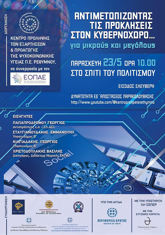 Το Κέντρο Πρόληψης των Εξαρτήσεων και Προαγωγής της Ψυχοκοινωνικής Υγείας Π.Ε. Ρεθύμνου, σε συνεργασία με τον Εθνικό Οργανισμό Πρόληψης και Αντιμετώπισης Εξαρτήσεων Ε.Ο.Π.Α.Ε., διοργανώνει ημερίδα ενημέρωσης – ευαισθητοποίησης για μαθητές Πρωτοβάθμιας και Δευτεροβάθμιας Εκπαίδευσης, εκπαιδευτικούς και γονείς, με θέμα