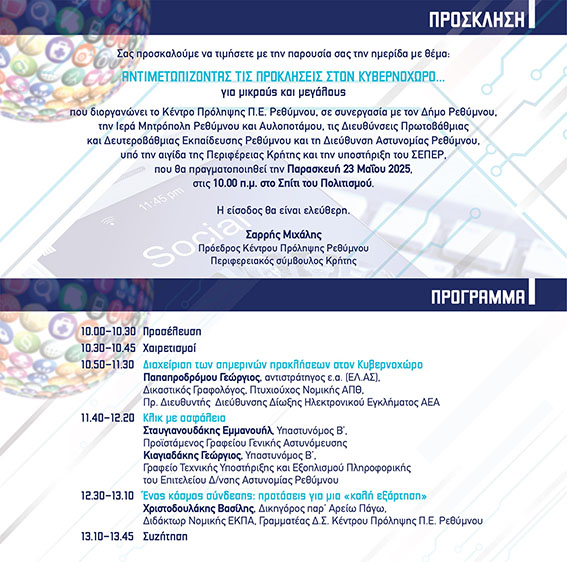 στις 10.00 π.μ. στο Σπίτι του Πολιτισμού, με εισηγητές τον κ. Παπαπροδρόμου Γεώργιο, αντιστράτηγο ε. α. ( ΕΛ.ΑΣ) – Δικαστικό Γραφολόγο – Πτυχιούχο Νομικής ΑΠΘ και Πρώην Διευθυντή Διεύθυνσης Δίωξης Ηλεκτρονικού Εγκλήματος ΑΕΑ,
