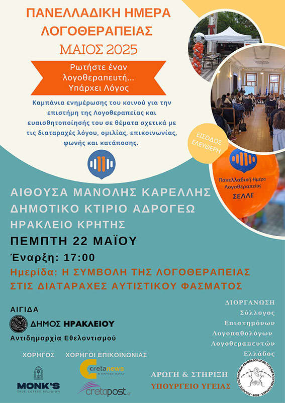 Ημερίδα με θέμα «Η συμβολή της λογοθεραπείας στις διαταραχές αυτιστικού φάσματος», διοργανώνει ο Σύλλογος Επιστημόνων Λογοπαθολόγων – Λογοθεραπευτών Ελλάδας, υπό την αιγίδα του Δήμου Ηρακλείου (Αντιδημαρχία Εθελοντισμού), την