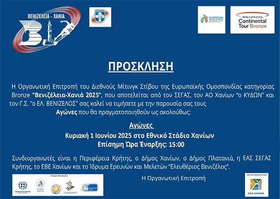 Την Κυριακή 1 Ιουνίου 2025 θα διεξαχθεί στο Εθνικό Στάδιο Χανίων η κορυφαία Διεθνής διοργάνωση στίβου της χώρας μας. Στα «ΒΕΝΙΖΕΛΕΙΑ – ΧΑΝΙΑ 2025» θα πάρουν μέρος 120 και πλέον κορυφαίοι αθλητές από όλο τον κόσμο, στα παρακάτω αγωνίσματα.