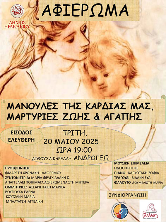 Εκδήλωση αφιέρωμα στη Γιορτή της Μητέρας με τίτλο «Μανούλες της καρδιάς μας – Μαρτυρίες ζωής και αγάπης» διοργανώνει η Αντιδημαρχία Εθελοντισμού του Δήμου Ηρακλείου σε συνεργασία με τον Σύλλογο Γονέων και Φίλων ΑΜΕΑ «Στην Αγκαλιά της Άννας» και την ομάδα HER-autism την