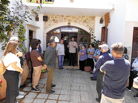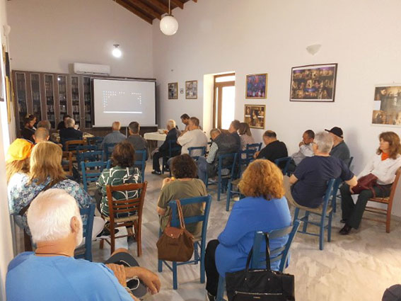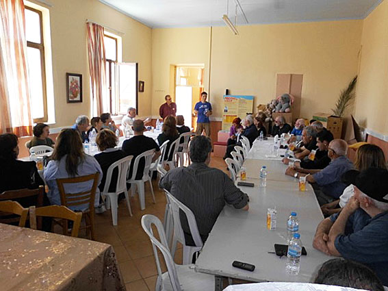 Εκεί δίπλα, στο παλιό Σχολείο τους υποδέχτηκαν ο πρόεδρος του Τοπικού Συμβουλίου Μάρκος Δρυγιαννάκης με χωριανούς του, και τους πρόσφεραν κέρασμα. Τους μίλησε σύντομα ο υπεύθυνος του προγράμματος Κρήτης του Συλλόγου Θαλάσσιας Χελώνας «Αρχέλων», ο οποίος αναφέρθηκε στις προσπάθειες προστασίας των ζώων αυτών και στη χρήση του χώρου ως ενημερωτικού κέντρου.