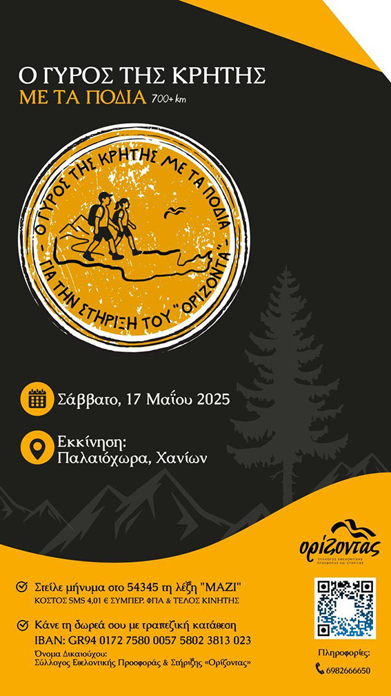 Μία πολυήμερη πεζοπορία 700+ χλμ, μέσα από μονοπάτια και διαδρομές και των τεσσάρων νομών της Κρήτης, με στόχο την ευαισθητοποίηση της κοινωνίας, της οικονομικής στήριξης του έργου του «Ορίζοντα» και φυσικά την ανάδειξη της θέλησης του ανθρώπου.