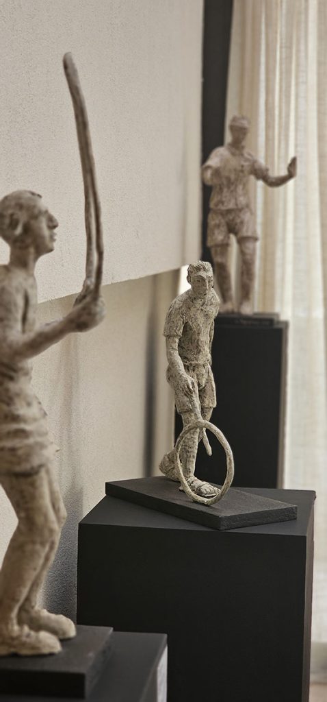 Ο δεύτερος άξονας είναι πιο νοσταλγικός και φωτεινός, αφορά στα παιδικά παιχνίδια που παίζαμε παλιά στις γειτονιές μας. Στην έκθεση παρουσιάζω γλυπτά που αναπαριστούν χειροποίητα παιχνίδια όπως το κουτσό, η τυφλόμυγα, το κρυφτό, η ρόδα, η σβούρα. Πρόκειται για παιχνίδια της παλιάς εποχής, της δικής μου γενιάς, που σήμερα έχουν σχεδόν χαθεί. Μέσα από αυτά τα έργα θέλω να αποτυπώσω καλλιτεχνικά τη ζωντάνια και την αθωότητα εκείνων των χρόνων, που έχουν σημαδέψει βαθιά την παιδική μου ηλικία και τη συλλογική μας μνήμη.