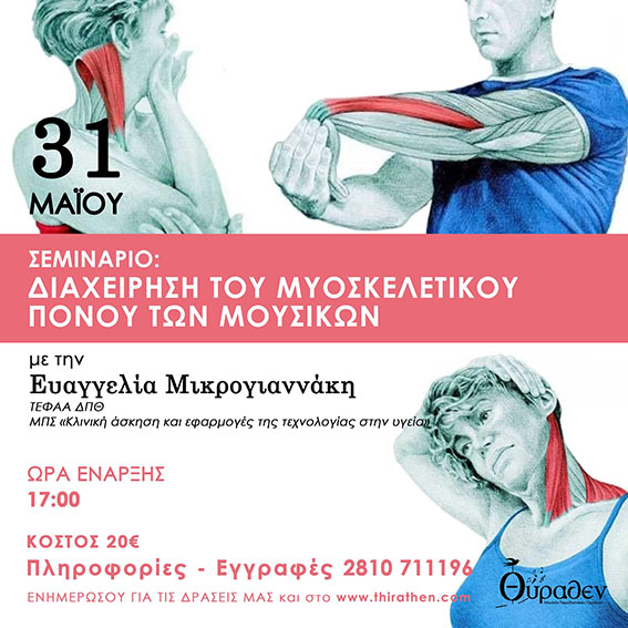 Το Μουσείο «Θύραθεν», σε συνεργασία με την Ευαγγελία Μικρογιαννάκη, φυσικοθεραπεύτρια με εμπειρία στον χώρο της σωματικής υγείας και της εργονομίας, διοργανώνει ένα εξειδικευμένο Σεμινάριο για τη διαχείριση των μυοσκελετικών πόνων που απασχολούν τους μουσικούς.