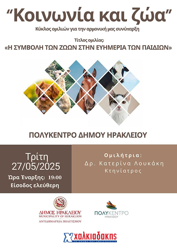 Συνεχίζεται ο κύκλος ομιλιών «Κοινωνία και Ζώα» από το Δήμο Ηρακλείου, την Τρίτη 27 Μαΐου 2025 στις 19:00 στο Πολύκεντρο του Δήμου Ηρακλείου με την καθηγήτρια Κατερίνα Λουκάκη.