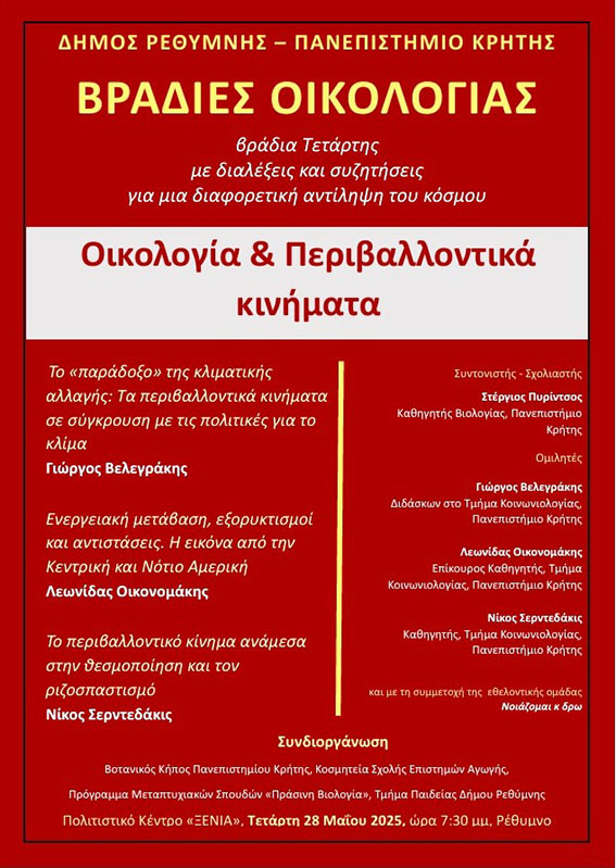 Το θέμα «Οικολογία & Περιβαλλοντικά Κινήματα» θα τεθεί στο επίκεντρο των εισηγήσεων και του διαλόγου που θα αναπτυχθεί στην επόμενη εκδήλωση του προγράμματος «Βραδιές Οικολογίας» που συνδιοργανώνουν ο Δήμος Ρεθύμνης και το Πανεπιστήμιο Κρήτης, την
