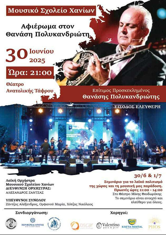 Στη συναυλία συμμετέχει η Λαϊκή Ορχήστρα του Μουσικού Σχολείου Χανίων, με έργα του Θανάση Πολυκανδριώτη και αγαπημένα κομμάτια της λαϊκής μας μουσικής.