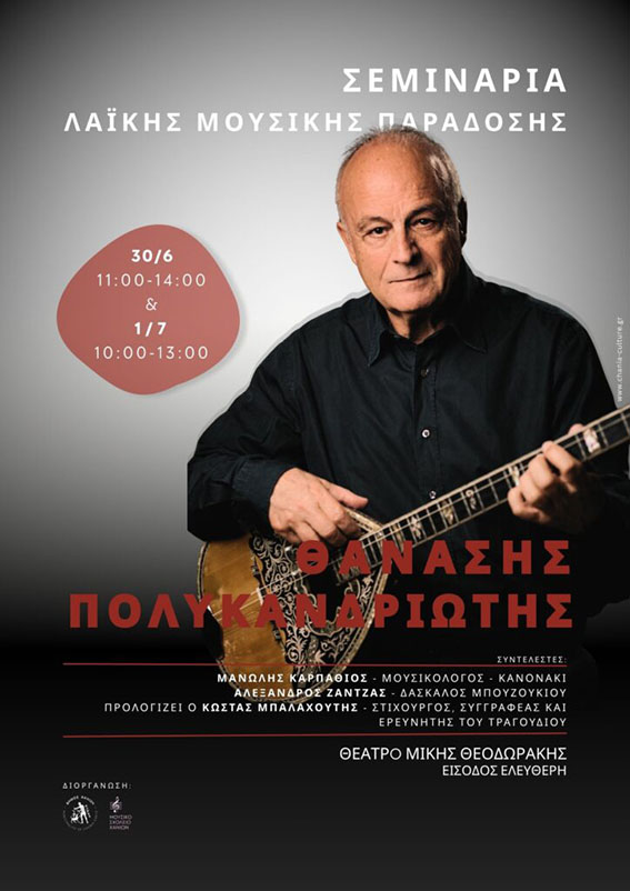 Το Μουσικό Σχολείο Χανίων τιμά τον μεγάλο συνθέτη και δεξιοτέχνη του μπουζουκιού Θανάση Πολυκανδριώτη, με ένα μουσικό αφιέρωμα και διήμερο σεμιναρίων αφιερωμένο στον λαϊκό πολιτισμό και τη μουσική παράδοση της Ελλάδας.