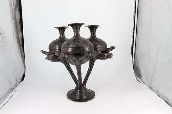 Ή τι σχέση μπορεί να δηλώνει ένας μεταλλικός αγγειοστάτης ετρουσκικού τάφου στα άγκιστρα του οποίου κρεμούσαν από τις λαβές τα αγγεία οινοποσίας σε σχέση με την Ελεύθερνα, στην οποία δεν έχουν έως σήμερα βρεθεί ανάλογα αντικείμενα; Ωστόσο στην απόληξη του ετρουσκικού αγγειοστάτη ως “λαλούντα σύμβολα” απεικονίζονται κεφαλές κρανοφόρων νεαρών πολεμιστών που δηλώνουν παραστατικά για το ποιοί χρησιμοποιούσαν τον αγγειοστάτη.