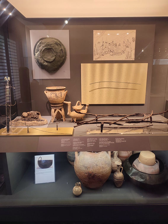 Όπλα αμυντικά για την προστασία της κεφαλής, του σώματος, των χεριών, των ποδιών: κράνη, πανοπλίες, περιβραχιόνια, μίτρες, περικνημίδες, ασπίδες… Όπλα επιθετικά, αιχμές δοράτων και ακοντίων, ξίφη, σπαθιά και μάχαιρες, βέλη… Αντικείμενα χρήσης: αγγεία πήλινα και χάλκινα για τροφή και πόση, πολυτελή ή καθημερινά, αλλά και για άλλες χρήσεις, αγγεία για λουτρό, καθαρισμό, αγγεία τεφροδόχα, λέβητες, κρατήρες, οινοχόες και κύλικες, φιάλες, καρποδόχες, λεκανίδες ή χέρνιβες… κι ακόμα κρατευτές και οβελοί (σούβλες), αρύταινες (κουτάλες σούπας), τυροκνηστίδες (τυροτρίφτες), φλασκιά…