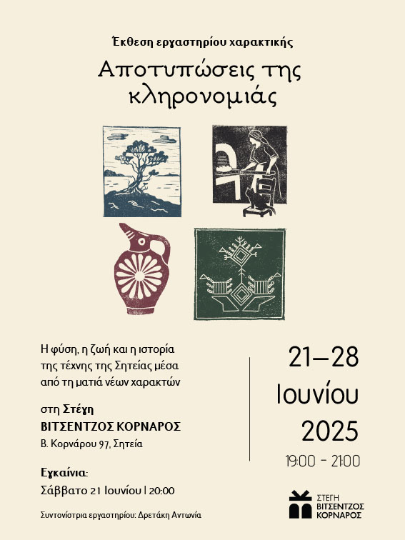 Το εργαστήριο χαρακτικής που πραγματοποιήθηκε στο Λαογραφικό Μουσείο Σητείας από τον Νοέμβριο έως τον Ιούνιο, παρουσιάζει την τελική του έκθεση με έργα πρωτότυπα και εμπνευσμένα από τη φύση, την καθημερινή ζωή και την καλλιτεχνική ιστορία της Σητείας.