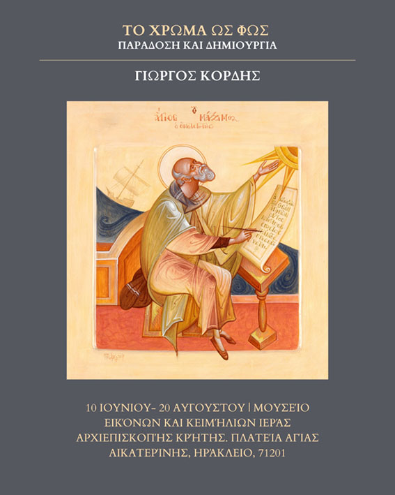 θα πραγματοποιηθούν τα εγκαίνια της έκθεσης του καταξιωμένου ζωγράφου και αγιογράφου Γιώργου Κόρδη, με τίτλο «Το χρώμα ως φως. Παράδοση και δημιουργία».