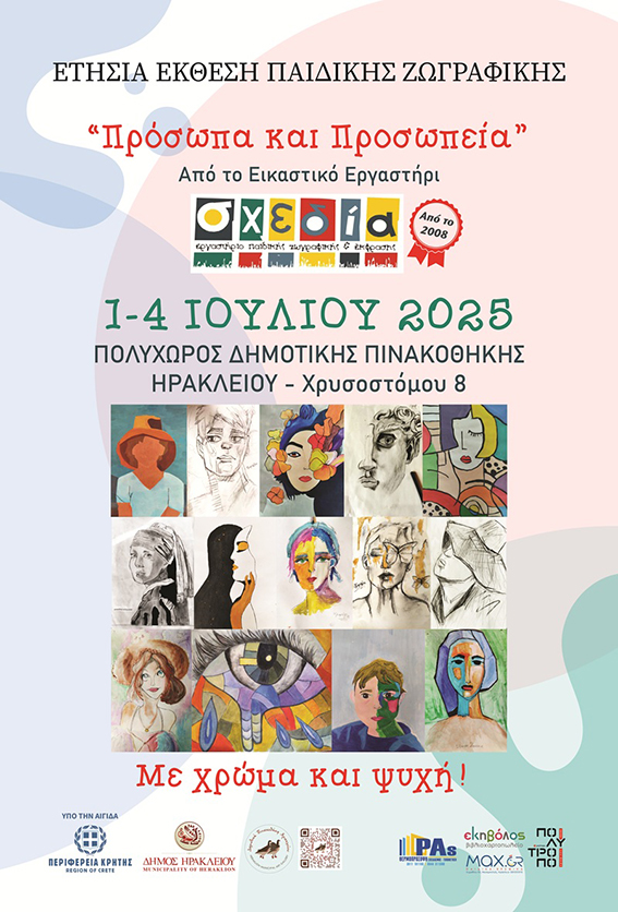 Η έκθεση παιδικής ζωγραφικής «Πρόσωπα και Προσωπεία», τελεί υπό την αιγίδα της Περιφέρειας Κρήτης και περιλαμβάνει μεταξύ άλλων το θεατρικό παιχνίδι «Το καπέλο που άκουγε τις σκέψεις…», με την ομάδα εμψυχωτών Θ.Π. Γιασεμιά και βραβεύσεις όλων των μαθητριών/μαθητών.Υπεύθυνη διδασκαλίας και για την καλλιτεχνική επιμέλεια της έκθεσης, είναι η εικαστικός Δήμητρα Μηλαθιανάκη.