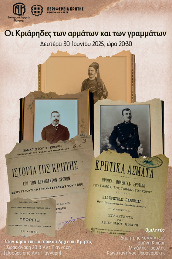 Τη Δευτέρα, 30 Ιουνίου 2025, και ώρα 20:30, στον κήπο του Ιστορικού Αρχείου Κρήτης θα πραγματοποιηθεί εκδήλωση αφιερωμένη στην πολύπλευρη προσφορά της οικογένειας των Κριάρηδων της επαρχίας Σελίνου στους αγώνες για την πατρίδα, καθώς και στους τομείς των γραμμάτων και της πολιτιστικής κληρονομιάς.